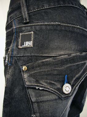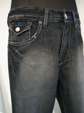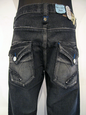 大きめにデザインされた、バックポケットとプラネットのボタンが特徴です。所々に入ったブルーのステッチもオシャレです★これからの季節に活躍するブラックジーンズ、オススメです!